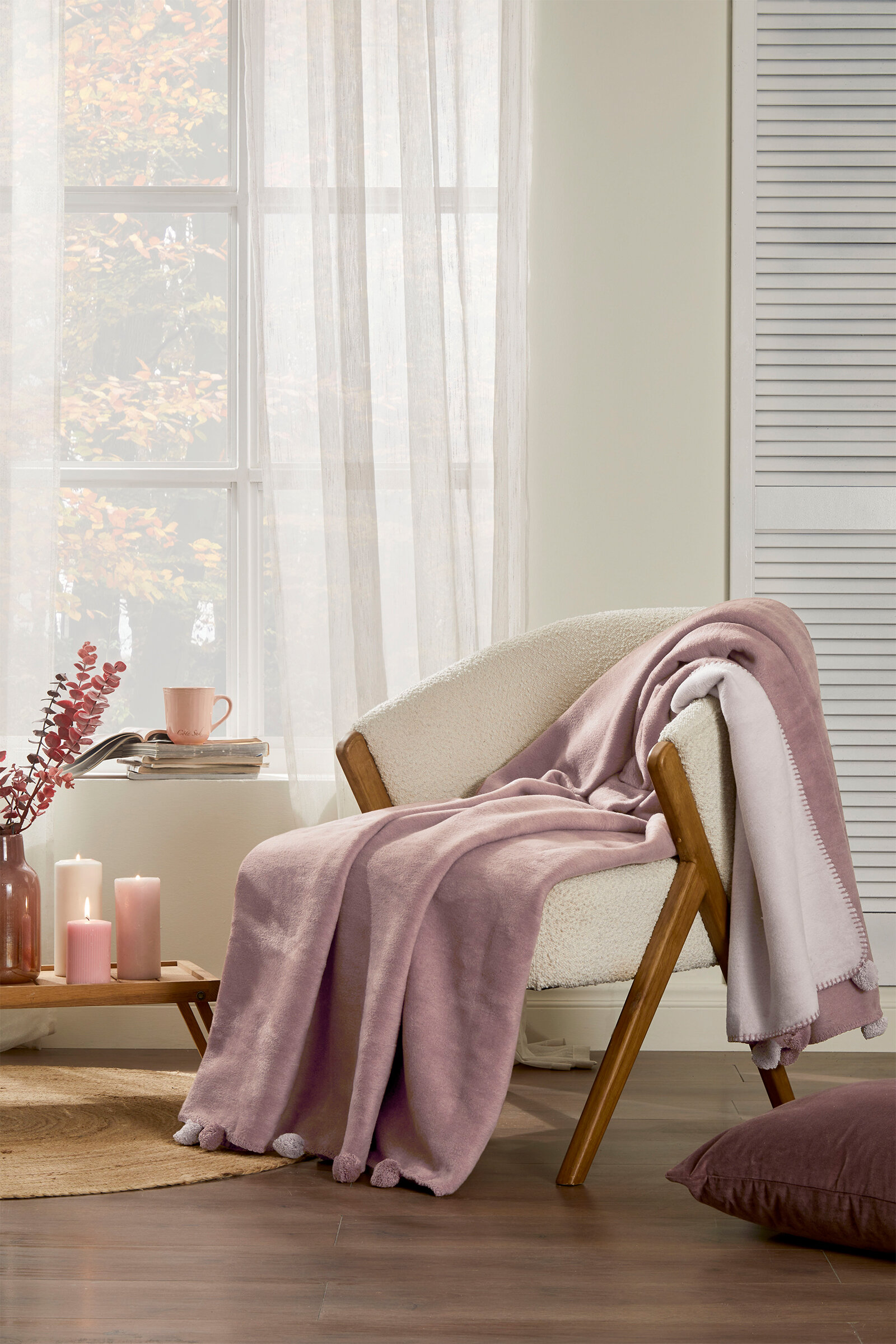 Ćebe za bračni krevet sa pomponima – Colourist, kašmir bež (180×220 cm)